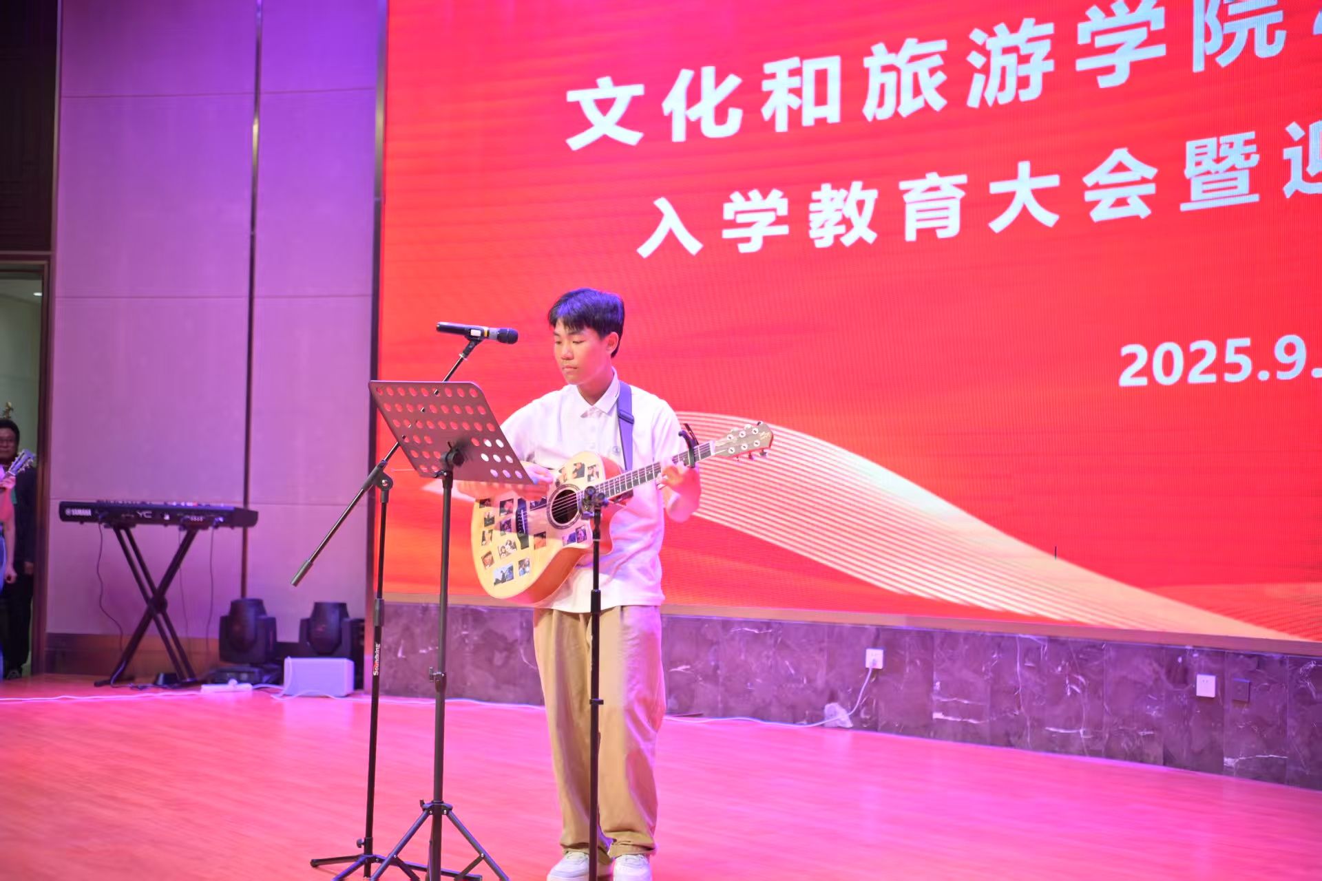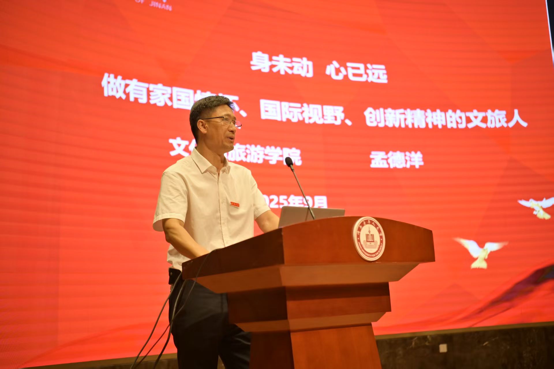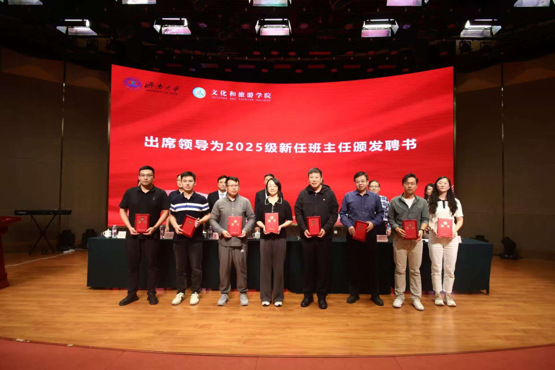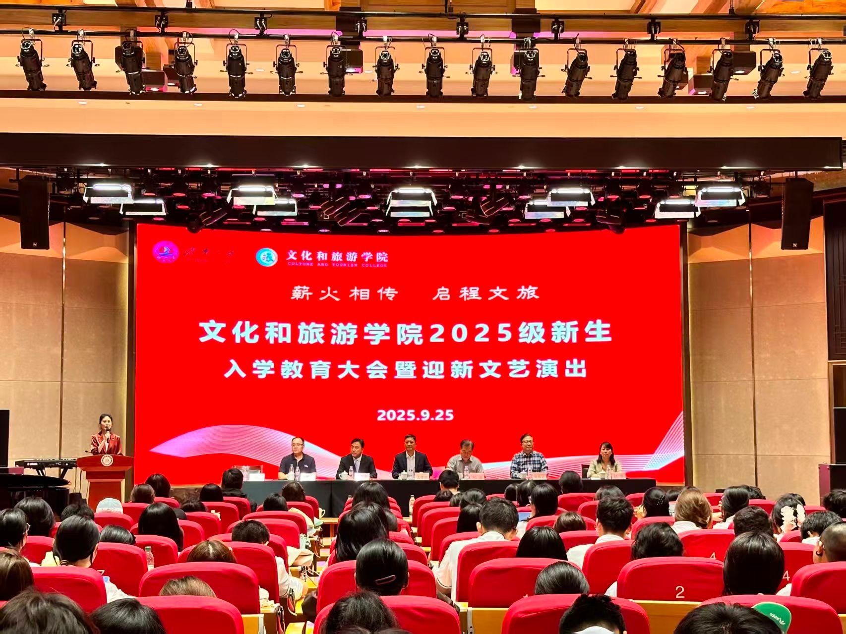 “薪火相传 启程文旅”2025级新生入学教育大会暨迎新文艺演出在济南老年人大学报告厅隆重举行。学院全体党政领导班子成员,各系教师代表、全体辅导员、新生班主任以及2025级全体本科生和研究生共同参加了这场青春盛典。