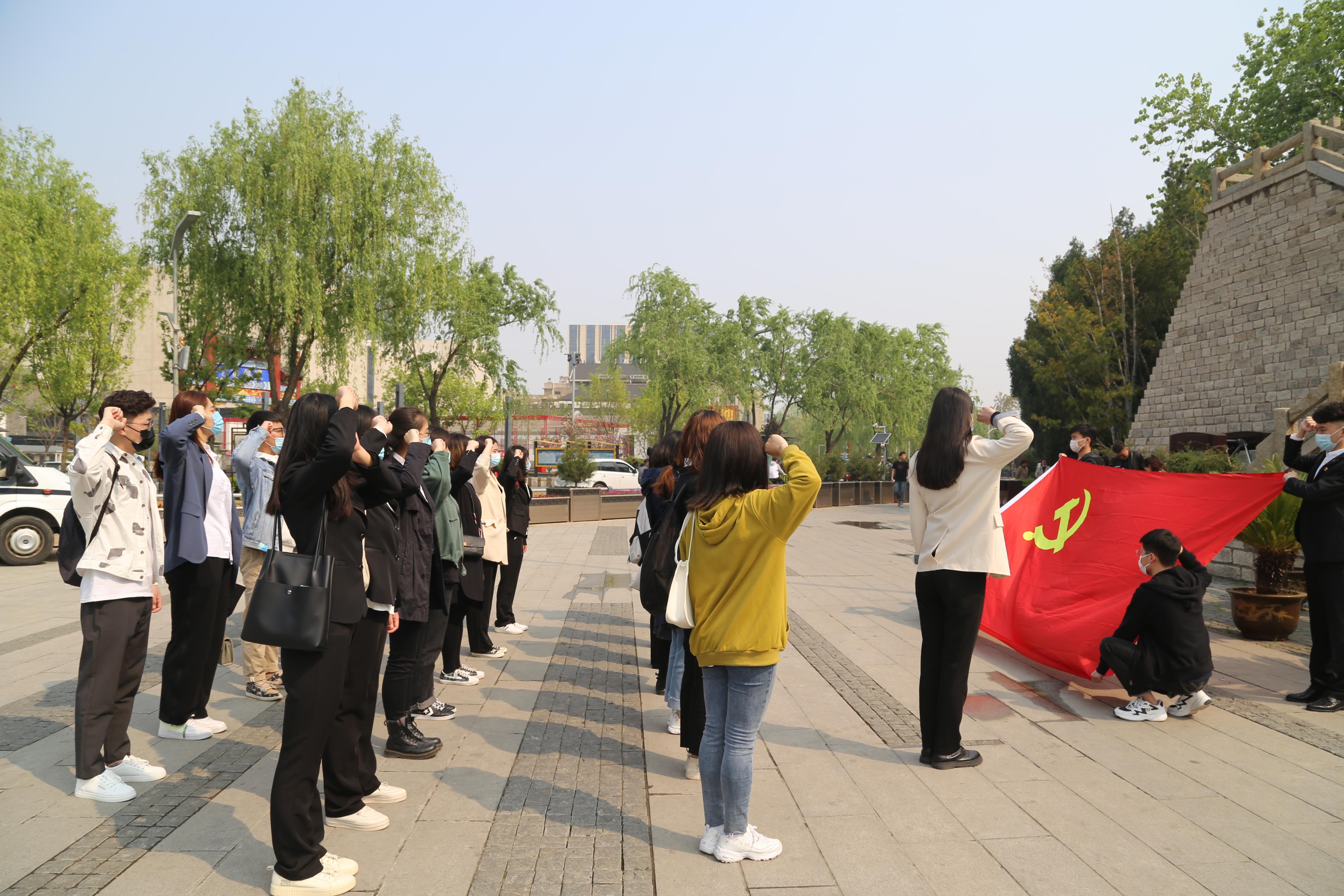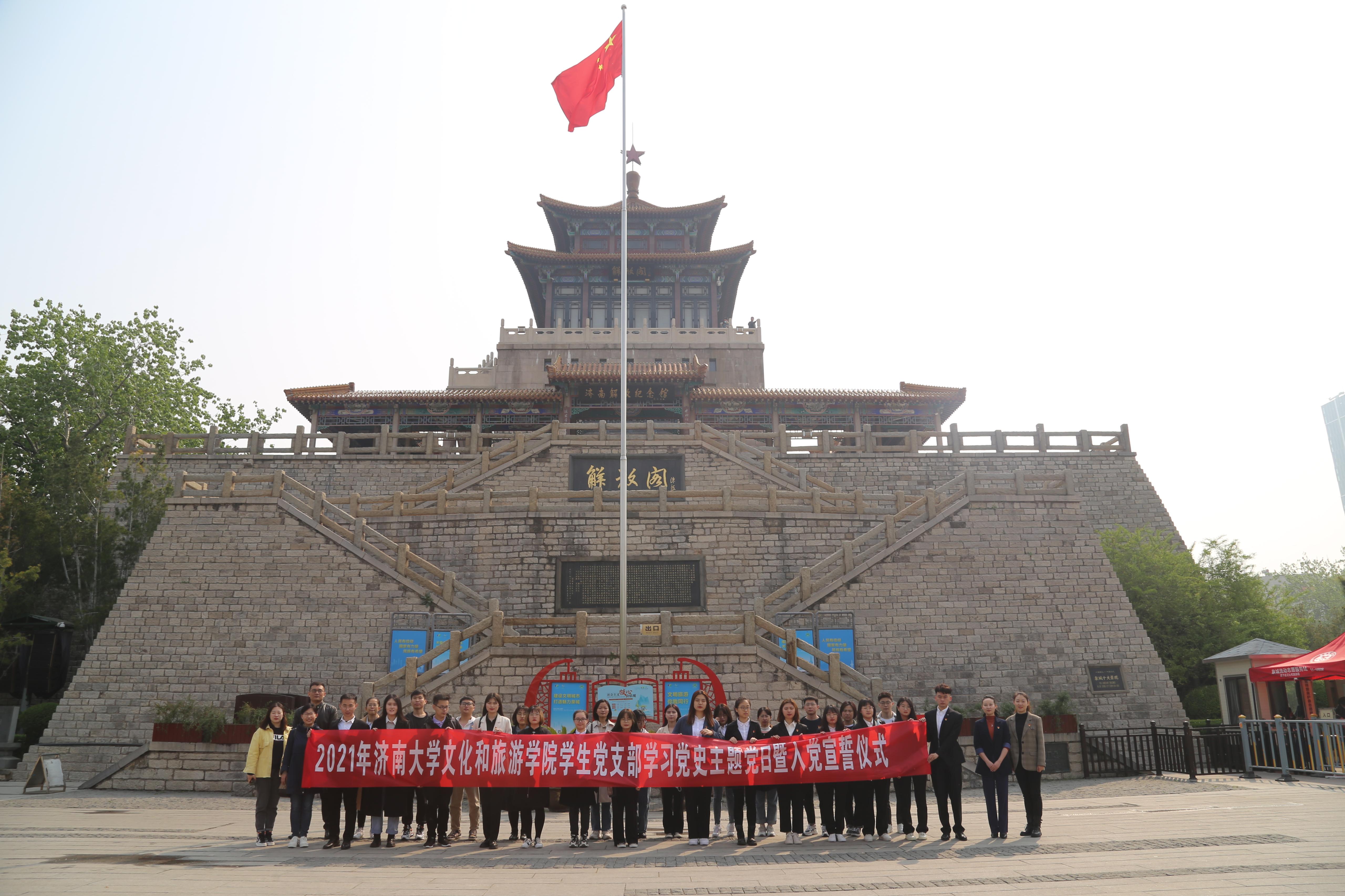 学生党支部来到济南市解放阁,开展学习党史主题党日暨2021年毕业生预备党员入党宣誓大会,2021届毕业生预备党员们在感受泉城的厚重历史中立下初心誓言。