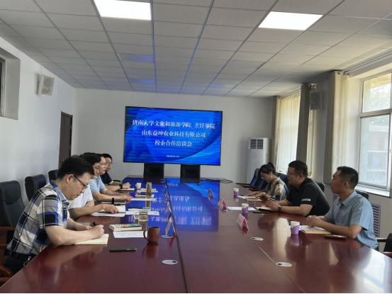 在人才培养、平台建设、社会服务等方面情况以及开展的一系列合作项目情况。姜义涛书记介绍了高密胶河社区基本情况以及山东益坤农业科技有限公司在会展服务、设计制作、旅游观光、食品研发等方面取得的成绩,以及今后发展方向。重点介绍了在食品研发、推广、中小学生研学等方面项目的合作发展情况。