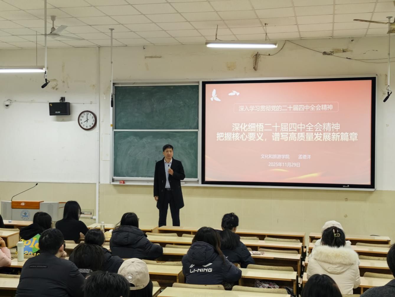 党委书记孟德洋在学院多媒体教室开展了党的二十届四中全会精神宣讲活动,以《深化细悟党的二十届四中全会精神,把握核心要义,谱写高质量发展新篇章》为题做宣讲报告。