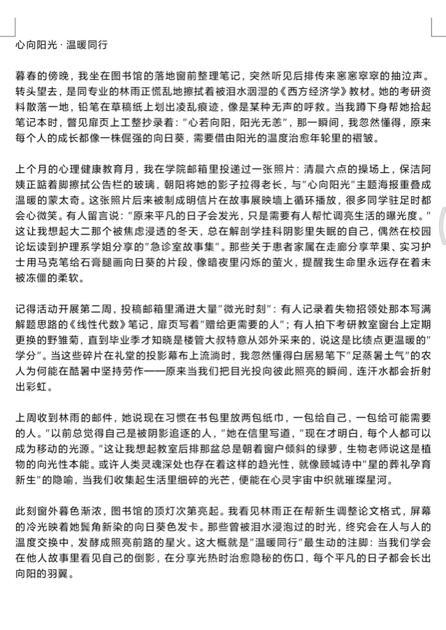 该活动于2025年5月19日-5月22日在线上举行。活动通知一经发布,便迅速点燃了同学们的参与热情。大家积极参与活动,踊跃提交作品。作品通过文字或镜头捕捉生活中充满阳光与温暖的瞬间,如校园里的互助场景、自然美景下的惬意时刻等。这些作品引发了学生们的广泛共鸣与互动交流,为心理健康教育注入了鲜活力量,抒发了同学们朝气蓬勃、积极向上的情感,在校园里营造出了互助共融的和乐氛围。
