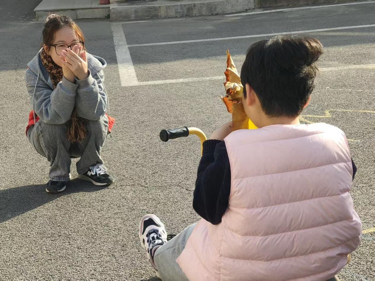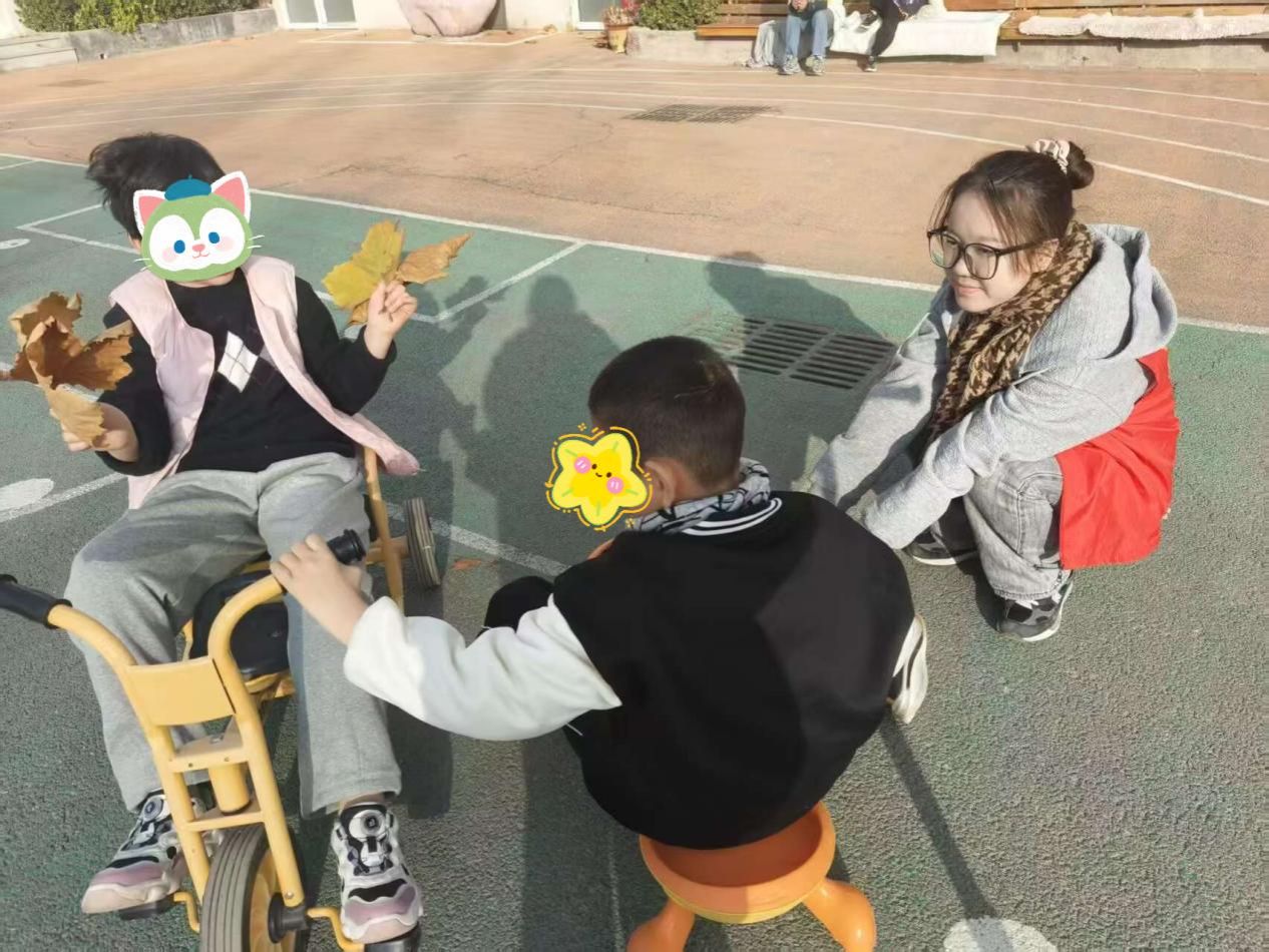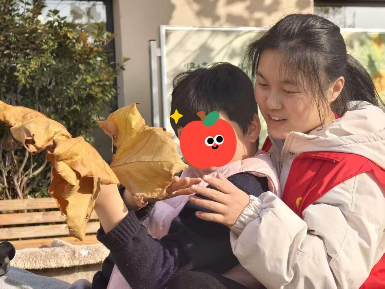 暖阳倾泻的活动场地,是童心与善意的栖息地。志愿者轻坐于儿童小车上,将孩子温柔拥入怀中,车轮轻转,载着清脆的笑声漫过暖阳;孩子掌心的落叶,是自然馈赠的礼物,在指尖翻飞间,晕开最纯粹的欢喜。志愿者俯身屈膝,与执叶的孩子静静对视,眼底的柔光化作桥梁,轻轻叩开“星星的世界”。风拂过发梢,叶影斑驳间,孩子的笑声似银铃般清脆,漫过时光,也漫进志愿者的心底。“哪怕只是并肩静握一片落叶,都觉得是在和他们的世界轻轻相连。” 志愿者吴琴的话语,恰是这场陪伴最动人的注脚。