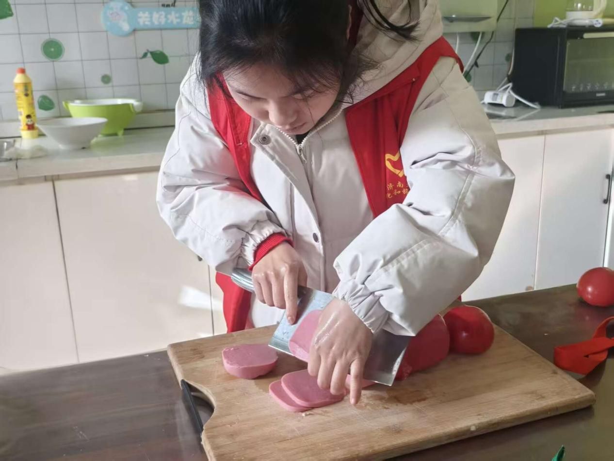 目光流转间,志愿服务的暖意漫进了厨房。志愿者化身温柔的“小老师”,立于砧板旁,将切菜的动作缓缓放慢,每一个动作都放缓了节奏,每一个细节都满含细心。孩子驻足凝视,目光紧紧追随着志愿者的指尖,好奇地触摸食材,认真地模仿动作,在一触一握、一看一学间,感知着生活的烟火气与生命力。“教他们辨识食材,学习简单操作,无关熟练与否,只为让他们在参与中触摸生活的温度,遇见成长的力量。”志愿者刘荣勤的话语,道出了这场实践最本真的意义,孩子专注的眼神,便是冬日里最珍贵的成长印记。