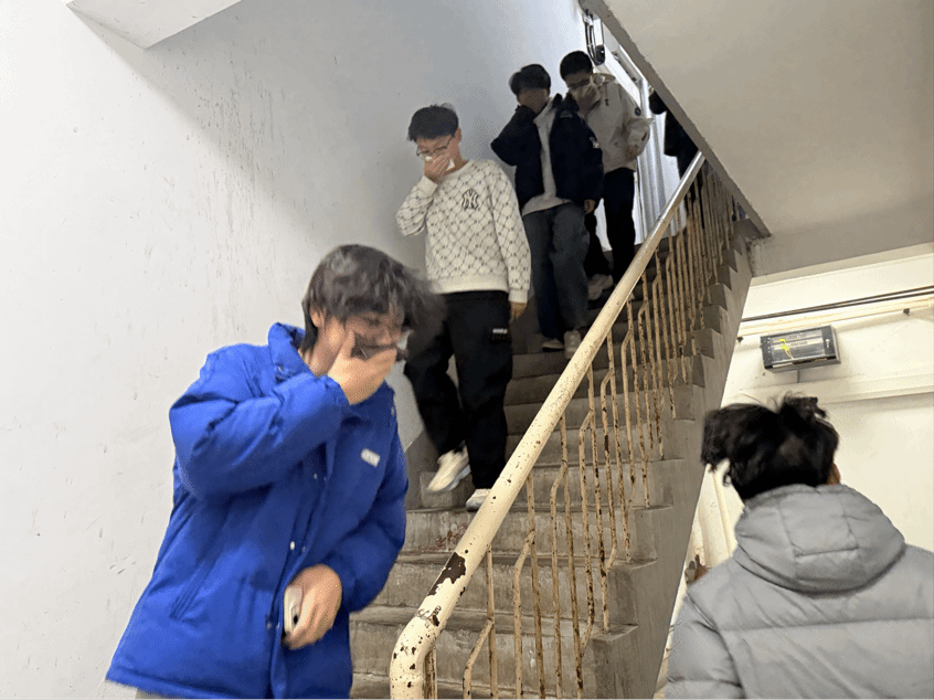 当日15:00,消防警报准时响起,演练正式拉开序幕。楼管员迅速开启逃生通道,在预设着火点点燃烟雾弹,模拟真实火情场景。接到警报后,学院辅导员迅速组织学生撤离,严格遵循“小火速灭,大火速撤”原则。撤离过程中,学生们手持自备毛巾捂住口鼻,弯腰低姿紧贴楼道墙壁逐层撤离,全程秩序井然,未出现拥挤、踩踏等情况。各楼层负责人坚守岗位、各司其职,全力维持疏散秩序,确保每一名学生安全抵达楼前指定集合区域。