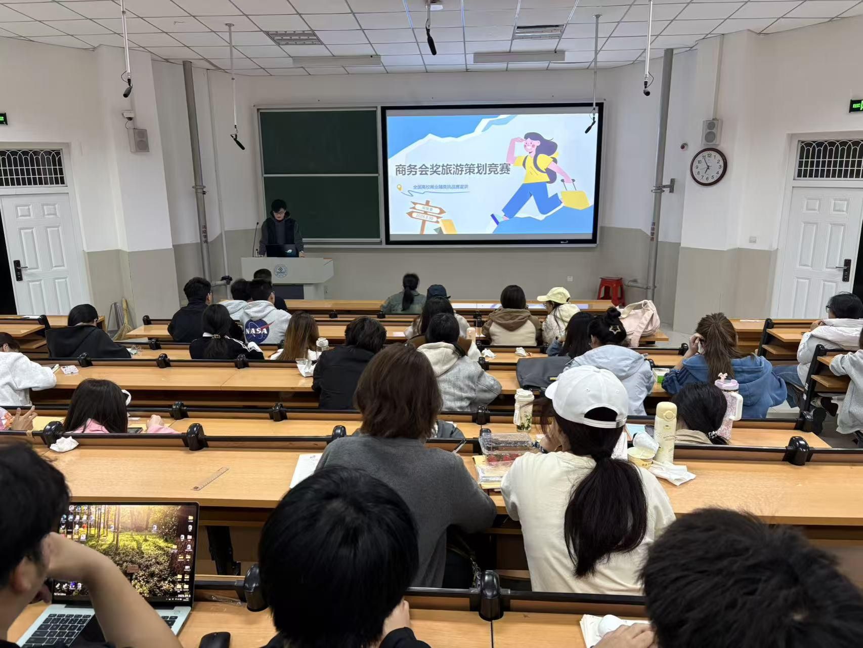 D3J201教室热烈展开。此次论坛作为第二期活动,紧密围绕全国高校商业精英挑战赛旅游策划竞赛展开宣讲,旨在激发同学们的创新创业潜能,提升旅游策划实践技能。
