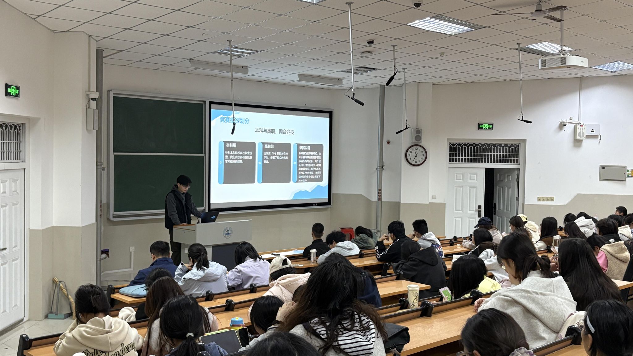 论坛特邀往届优秀获奖代表胡展豪同学担任主讲嘉宾。胡展豪同学以其丰富的参赛经验,从赛事流程、规则评审、备赛技巧三大维度进行了全面而深入地分享。他首先梳理了赛事的全流程,从知识赛的个人考核到省赛、国赛的团队协作,每个环节都讲解得细致入微。接着,他详细解读了竞赛规则,特别是“知识赛”与“实践赛”两大环节的具体要求,为同学们指明了晋级路径和团队组建方向。