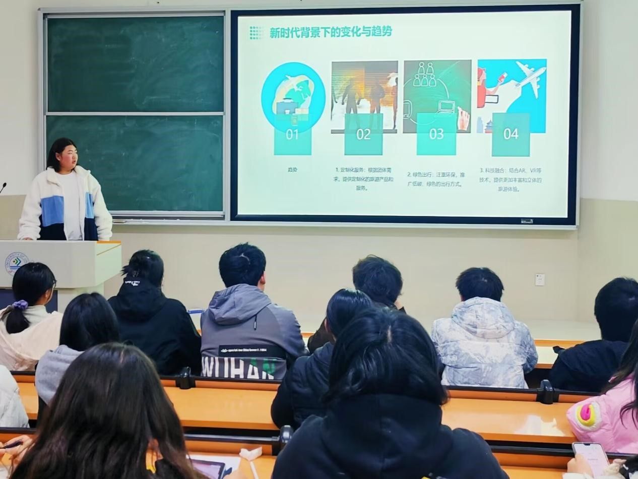 主讲人孙方瑜同学以“新时代近郊团体游”为主题,从新时代近郊团体旅游的概述、近郊团体旅游的新方式、实践与案例及挑战与展望四个角度出发,向大家介绍了近郊团体旅游在紧密团队行动、近距离出行、充分运用节假日时间方面的关键特性,引导同学们进一步了解新时代近郊团体旅游的内涵。她提到,现代旅游产业应以顾客为导向,提供涵盖景点选择、活动安排、餐饮推荐的个性化旅游路线定制服务,以满足不同消费者的需求。孙方瑜同学认为,凭借定制化的旅行线路设计、智慧旅游技术的应用以及环保出行的理念,新时代近郊团体游定能在未来成为大众所热爱的休闲娱乐方式之一。
