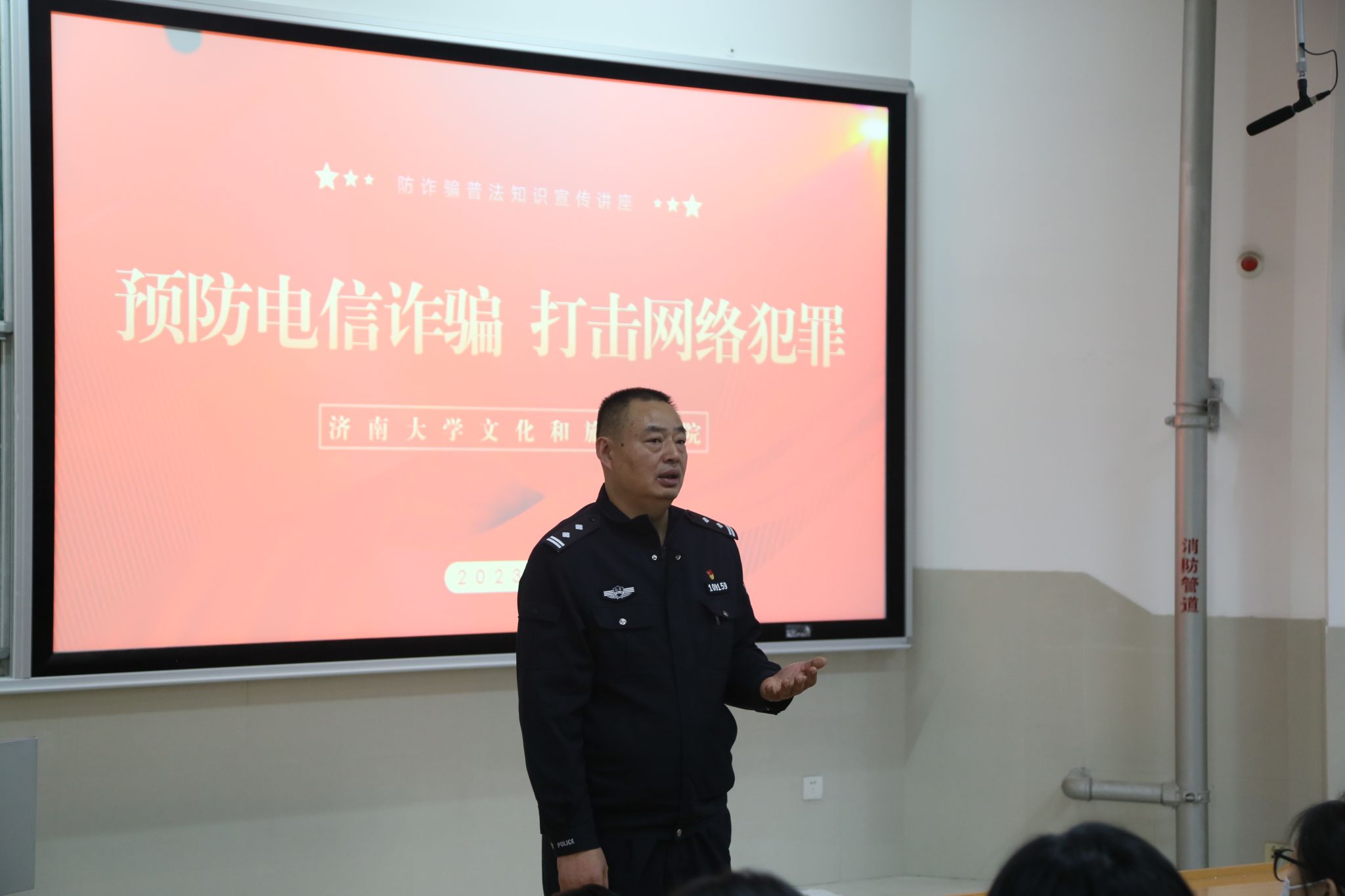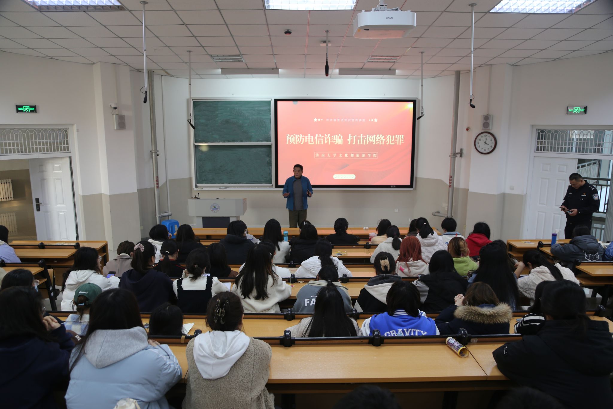 保卫处,邀请济南市公安局舜玉路派出所在舜耕校区三教201教室开展了防范电信诈骗宣传讲座。济南市公安局舜玉路派出所副所长孙全修警官、学校保卫处舜耕校区保卫科科长张韶春、学办部分老师及200余学生参加此次活动。讲座由学办老师王明扬主持。