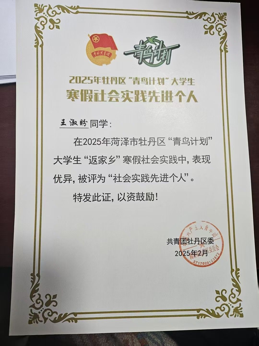 传媒2302王淑盼同学通过“青鸟计划”平台,在菏泽市牡丹区胡集镇人民政府镇团委开展为期14天的寒假社会实践,以专业行动服务家乡发展。